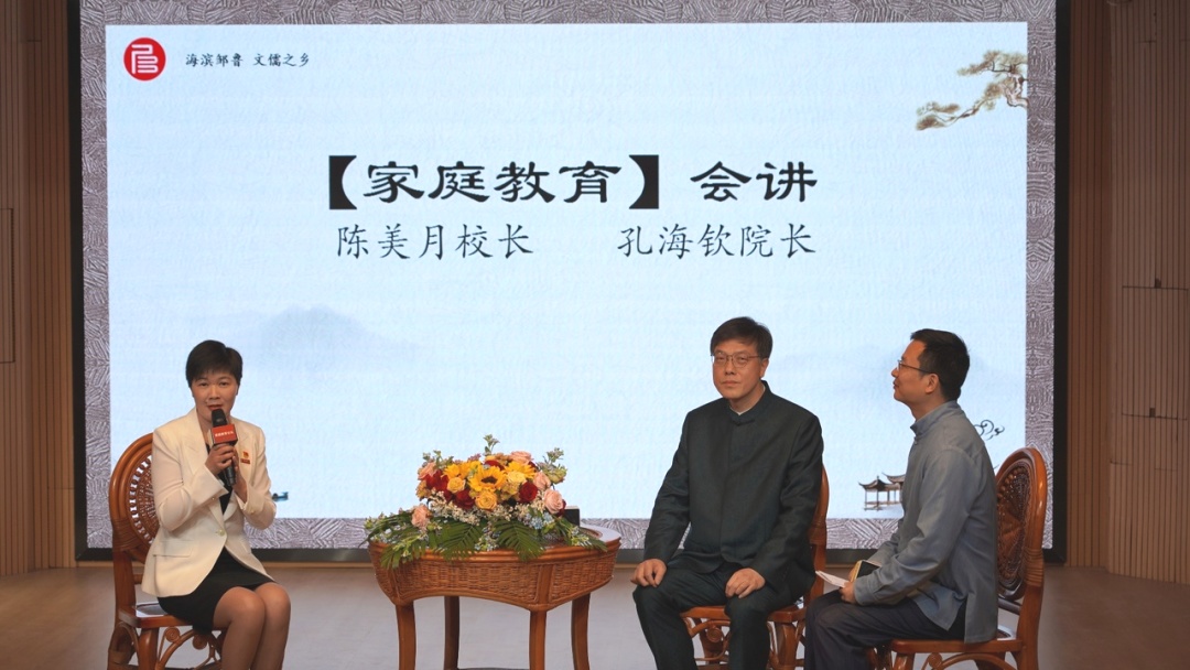 随後,孔海(hǎi)欽老師(shī)與陳美(měi)月(yuè)校(xiào)長進行(xíng)了家庭教育會(huì)講。會(huì)講中,陳美(měi)月(yuè)校(xiào)長介紹了本校(xiào)以三個(gè)核心要點:以師(shī)教爲源頭、塑造獨具魅力的(de)學宮文(wén)化、使地(dì)處僑鄉的(de)孩子兼具民(mín)族情懷,以此把中華傳統文(wén)化進校(xiào)園作爲教學工(gōng)作的(de)重要抓手,将經典古詩文(wén)融入各學科,讓學生全方位感知中華經典文(wén)化之魅力。她向孔老師(shī)提出應如(rú)何在現有(yǒu)的(de)工(gōng)作上(shàng)把中華傳統文(wén)化做得更深刻、更完善的(de)相(xiàng)關問題。孔海(hǎi)欽老師(shī)針對問題提出了富有(yǒu)建設性的(de)意見和(hé)建議。