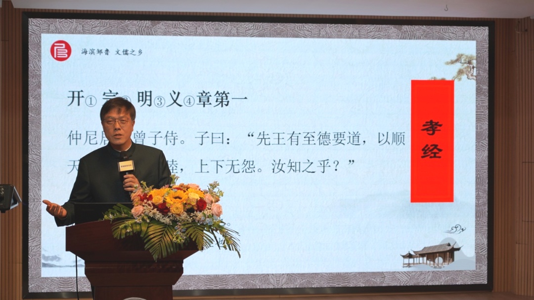 主講人(rén)文(wén)儒學院院長孔海(hǎi)欽老師(shī)進行(xíng)了“學經典 益終身”的(de)主題講座。